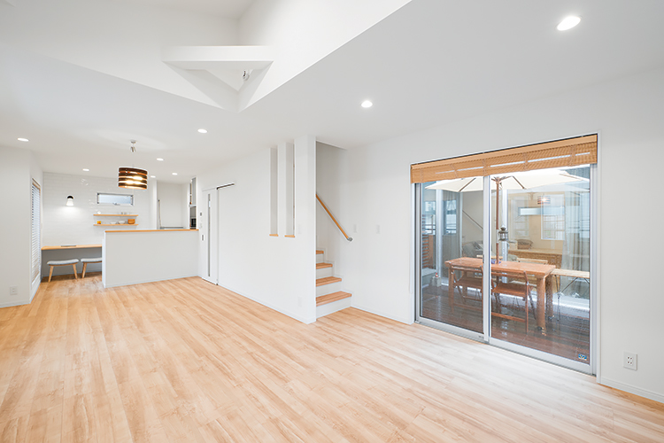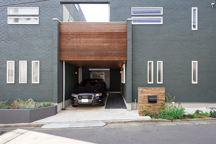 一見するとひとつの大きなお住まいに見えますが、バルコニーでつながる完全分離型二世帯住宅です。外観がブルーグリーンの表情豊かな塗り壁でとても印象に残る雰囲気になりました。内部はそれぞれの家族の希望をふんだんに取り入れとても住み心地の良い空間が広がっています。